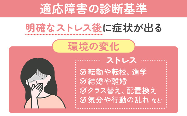 精神疾患の分類診断の基準によれば、はっきりと識別できるストレスがありそのことが原因で感情的・行動的な症状が出現し、発症は1ヶ月以内とされています。