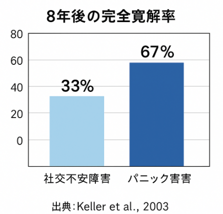 長期追跡研究では、社交不安障害は完全には改善しにくい傾向が示されており、8年追跡の自然経過研究では約3分の1しか完全に改善したと思えるに至ったに過ぎないのに対し、パニック障害では 2/3 を超える割合が完全に改善したと思えるに至ったという報告があります。