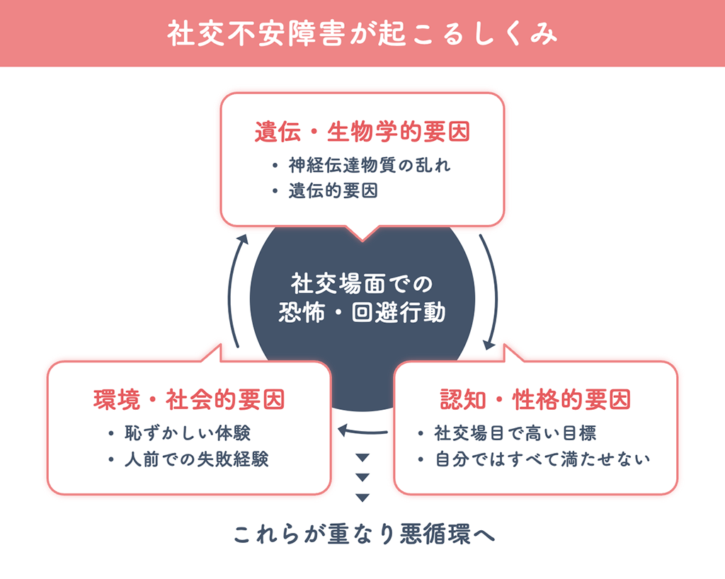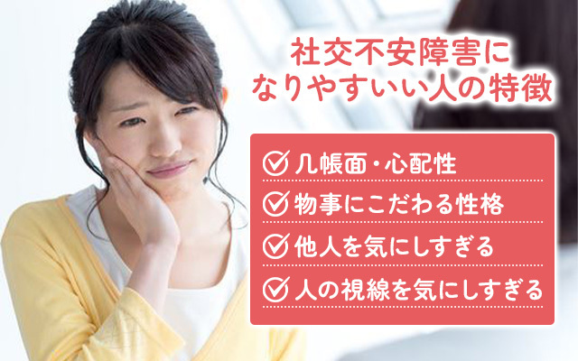 環境によっても障害が出ることもあり、もともと不安傾向であったが、職場の配置が変わり人前で話すことが増えたりすると発症します。